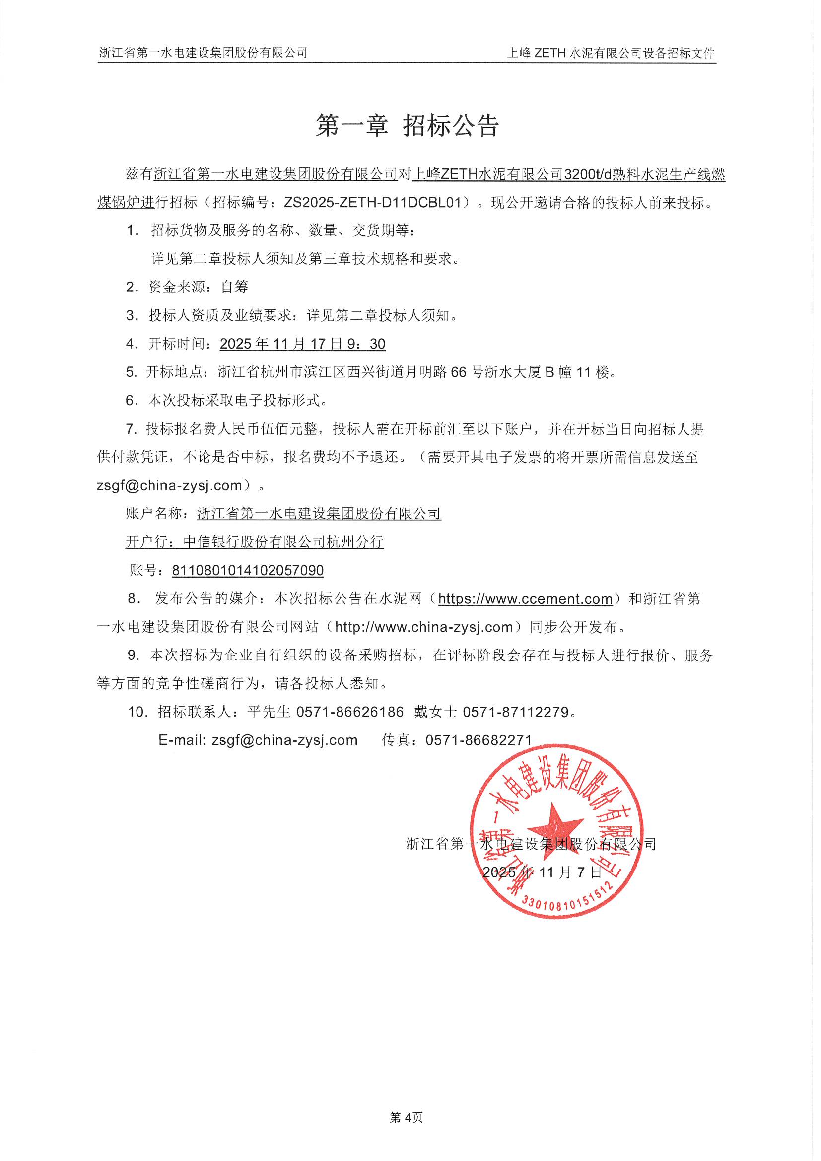 上峰ZETH水泥有限公司3200t/d熟料水泥生產(chǎn)線燃煤鍋爐招標公告
